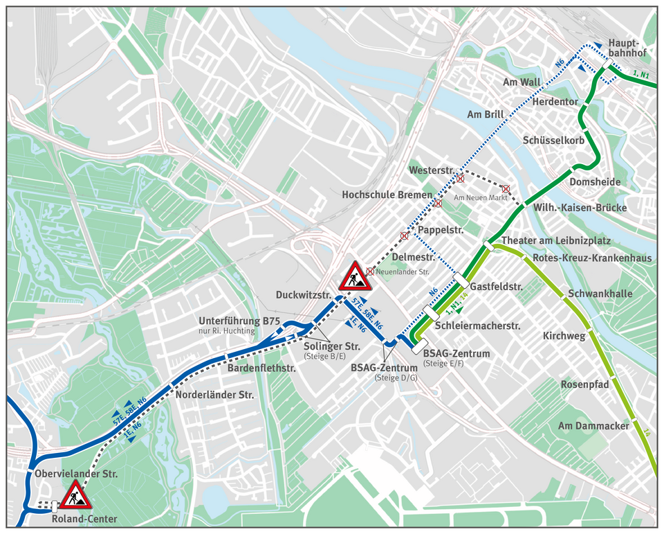 - Die Linie N6 fährt ab Roland-Center als Ersatzverkehr weiter bis zum Hauptbahnhof.