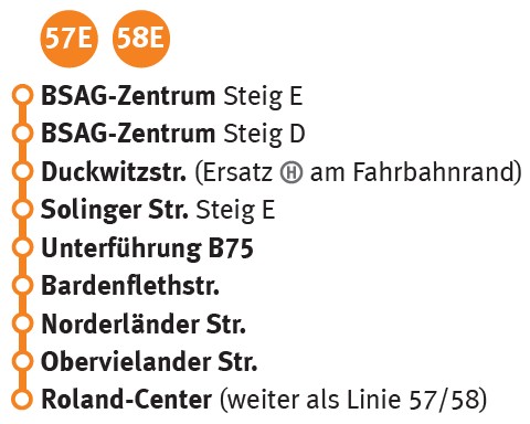 - Die ankommenden Busse der Linien 57 und 58 fahren ab Roland-Center weiter als Ersatzbusse der Linie 1E bis zum BSAG-Zentrum.